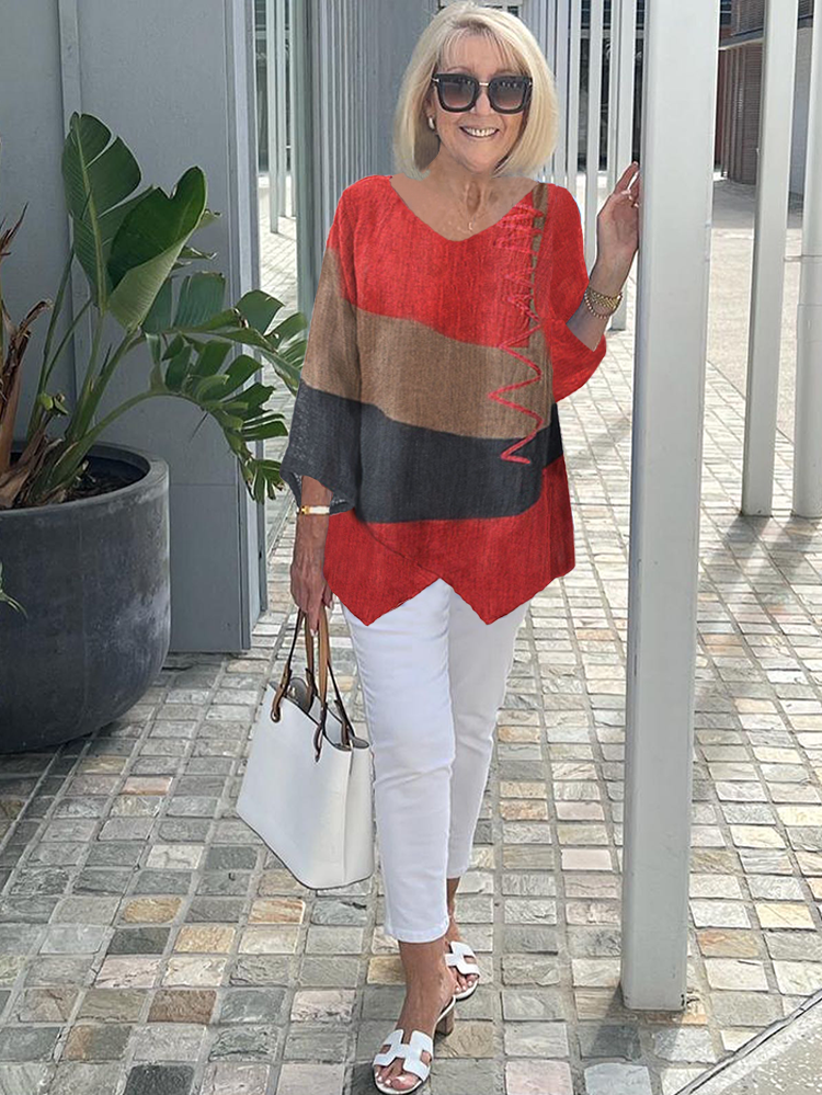 Casual Loose V-neck Irregular Hem Art Print Long Sleeve Tops