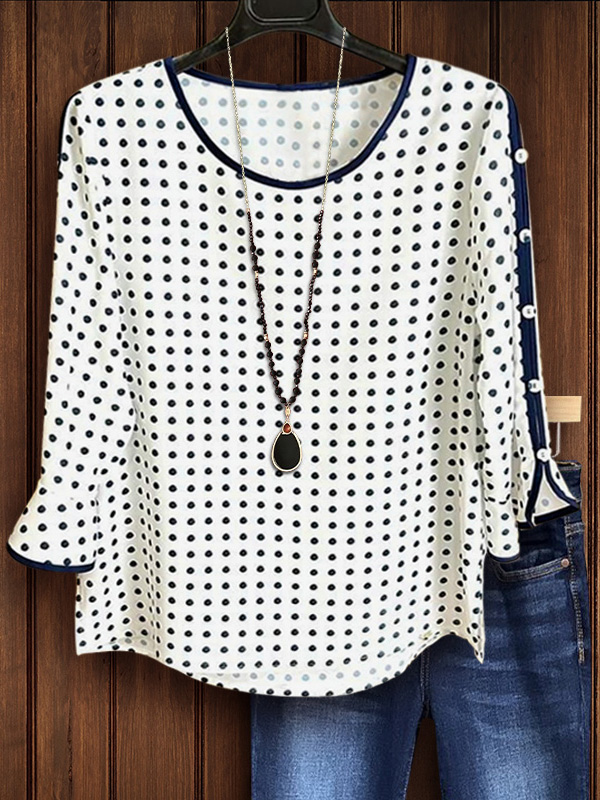 This loose linen top offers effortless style. The relaxed fit and Dolman sleeves create a casual yet chic look, perfect for casual outings or relaxing at home. A polka dot print adds interest to this classic top, making it a must-have for the stylish woman.