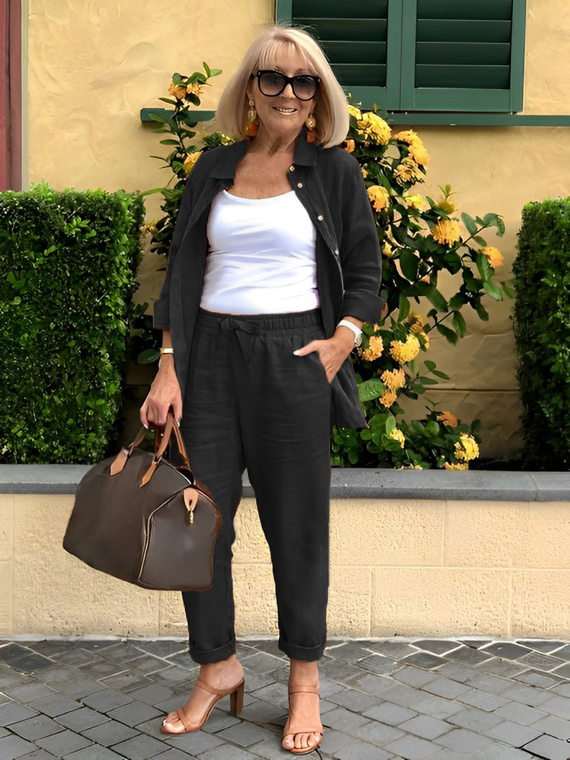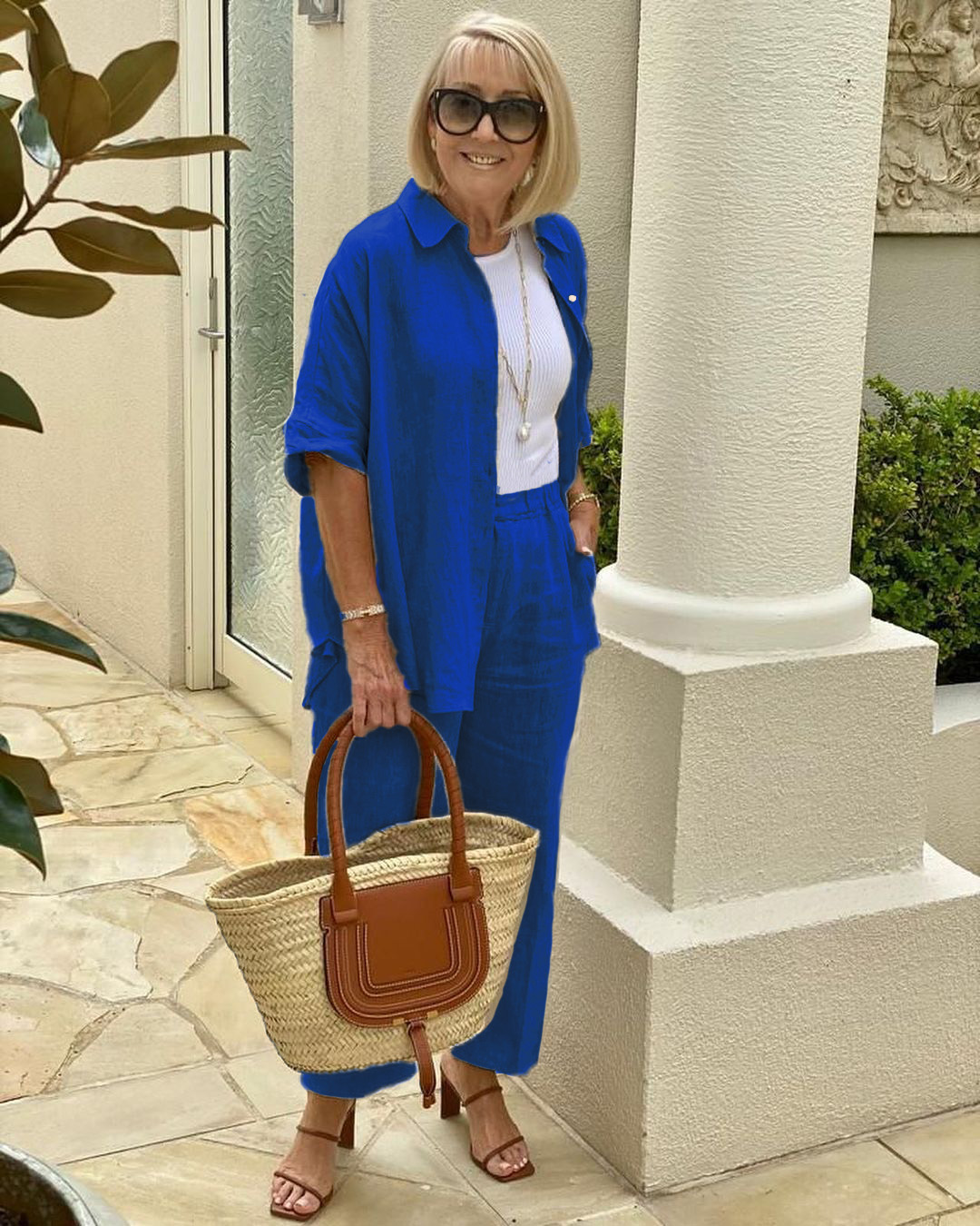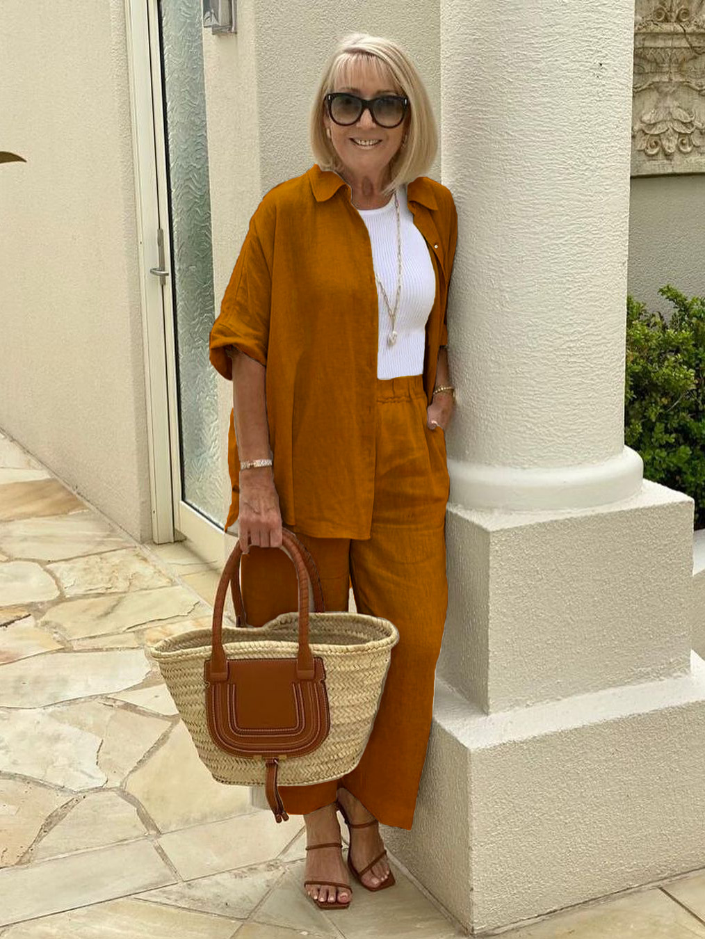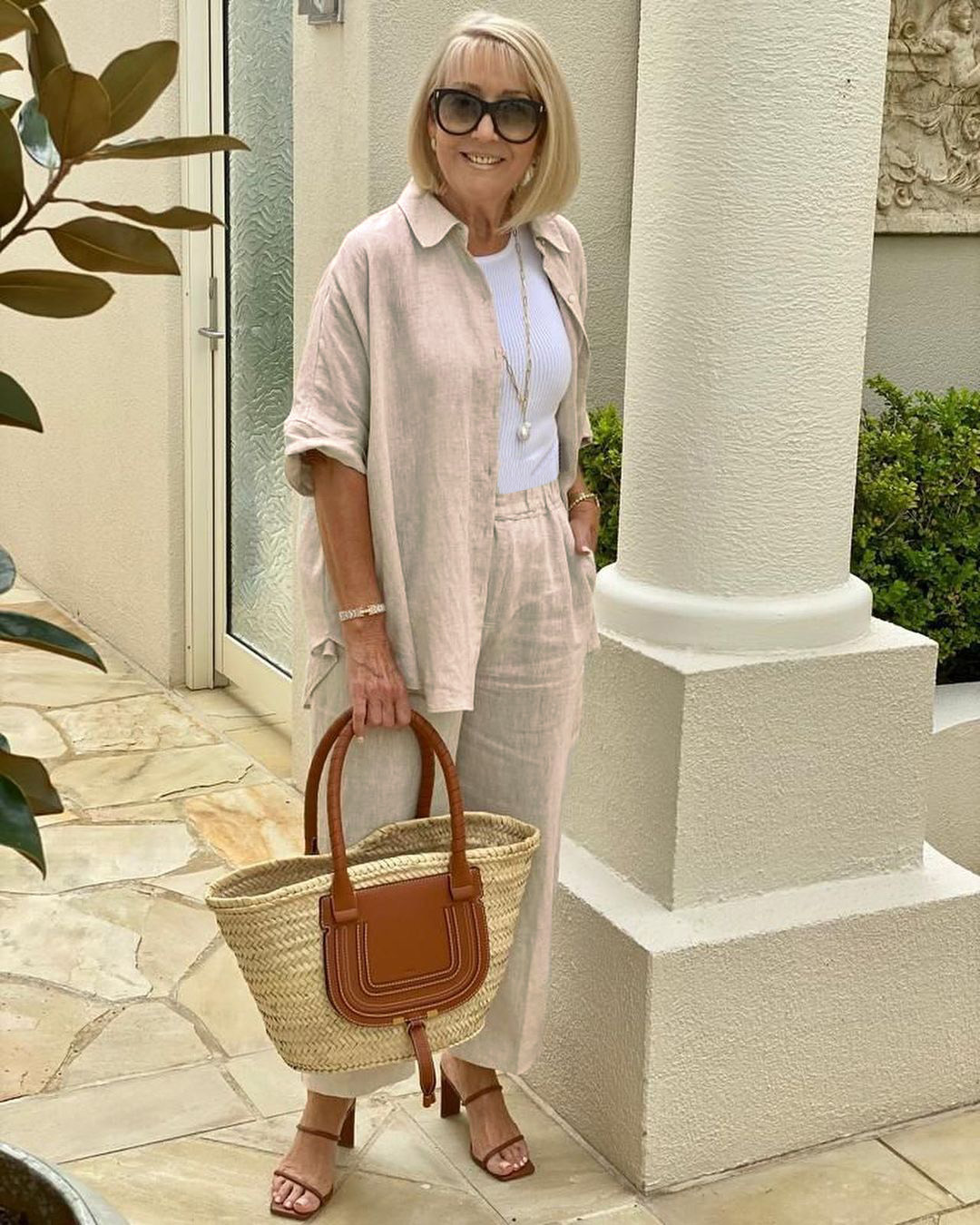Neutral colour tones always look fabulous when you add a little WHITE. A rattan tote and tan heels complete the look with style. I have added one of my favourite NECKLACES featuring a gold anchor style chain and a gorgeous BAROQUE PEARL to elevate this chic look.⠀