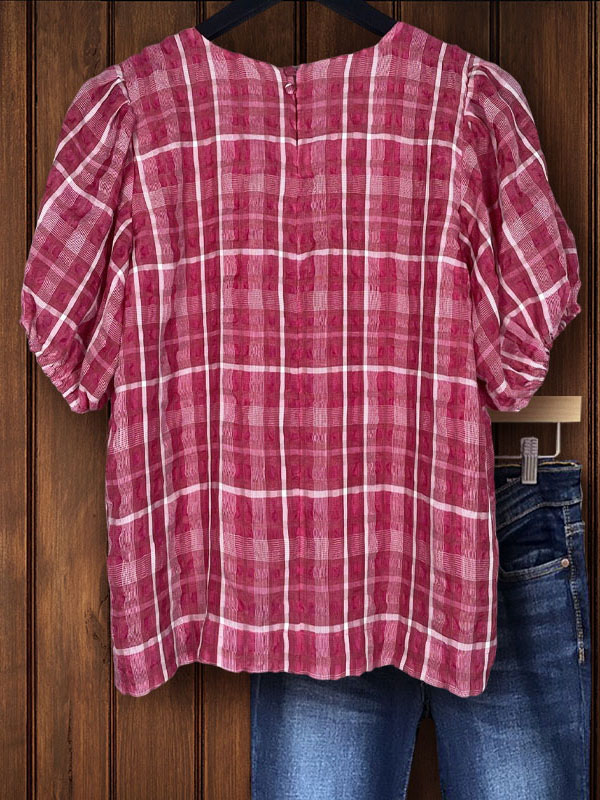 Add a pop of color to your wardrobe with this red plaid top. This top is made from breathable bubble-textured fabric that enhances the overall casual and unique feel. The combination of bright red plaid print and puff sleeves easily creates a retro and sweet look.