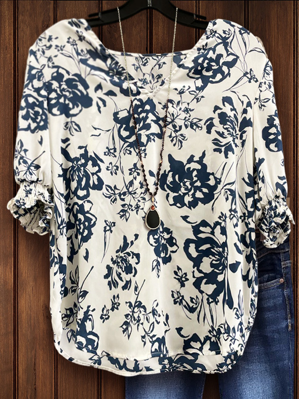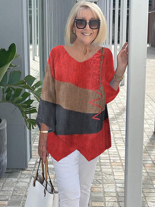 Casual Loose V-neck Irregular Hem Art Print Long Sleeve Tops