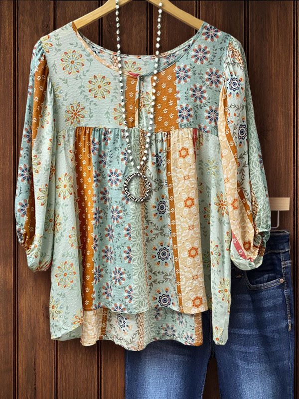 This top features a delicate floral print and a lace-up neck design with ruffle details that enhance the overall elegant vibe. The romantic ruffled sleeves and lightweight, breathable fabric give it a charming, feminine look that can be worn with slacks or a skirt.