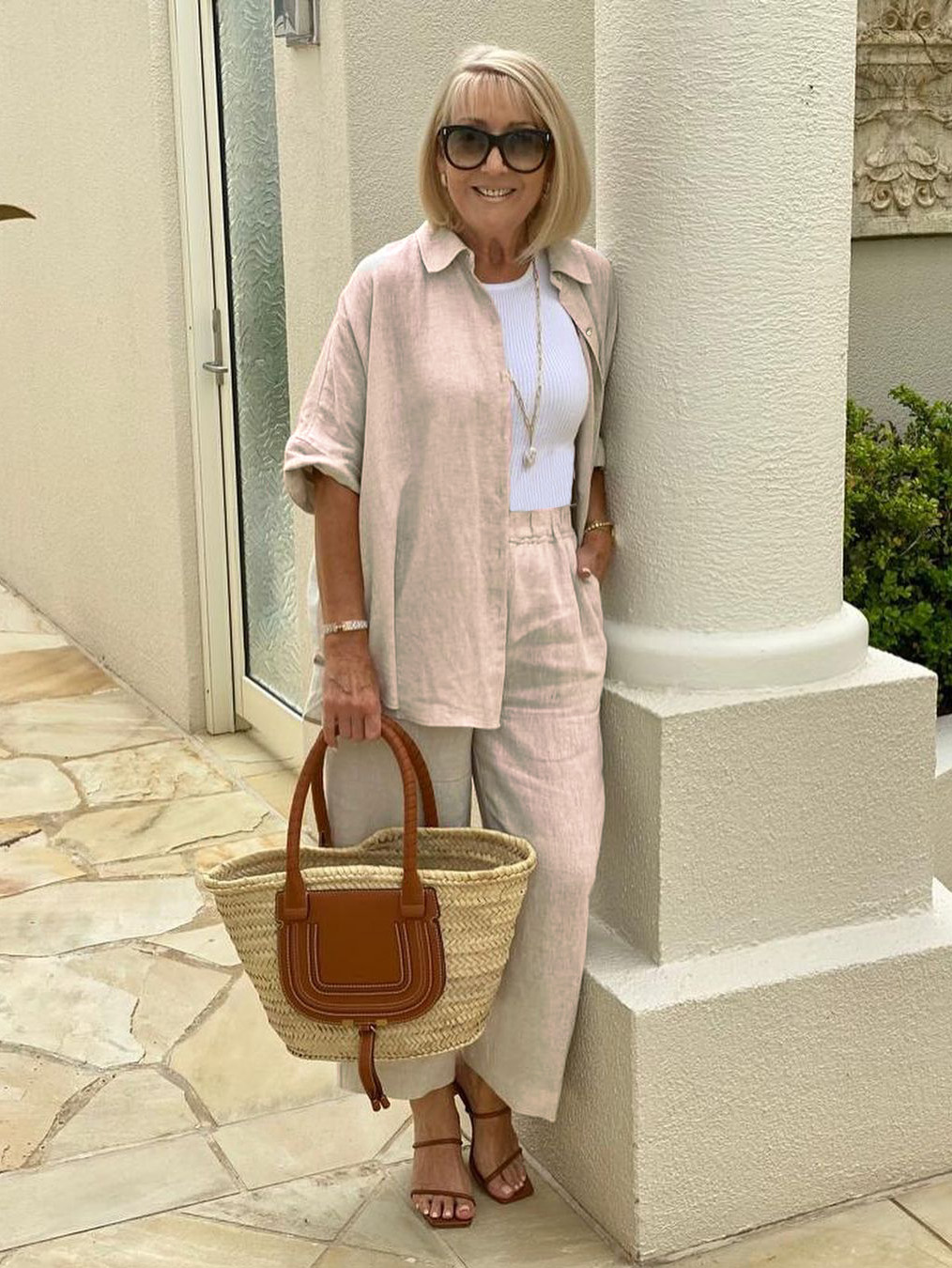 Neutral colour tones always look fabulous when you add a little WHITE. A rattan tote and tan heels complete the look with style. I have added one of my favourite NECKLACES featuring a gold anchor style chain and a gorgeous BAROQUE PEARL to elevate this chic look.⠀
