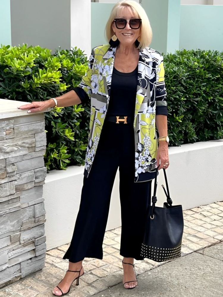 A great addition to any wardrobe is a gorgeous STATEMENT BLAZER and this one  ticks all the boxes for us. Adding a SPLASH OF COLOUR to total BLACK, this look is elegant and very stylish. Perfect styles for travelling, going out for dinner or even heading to the office.